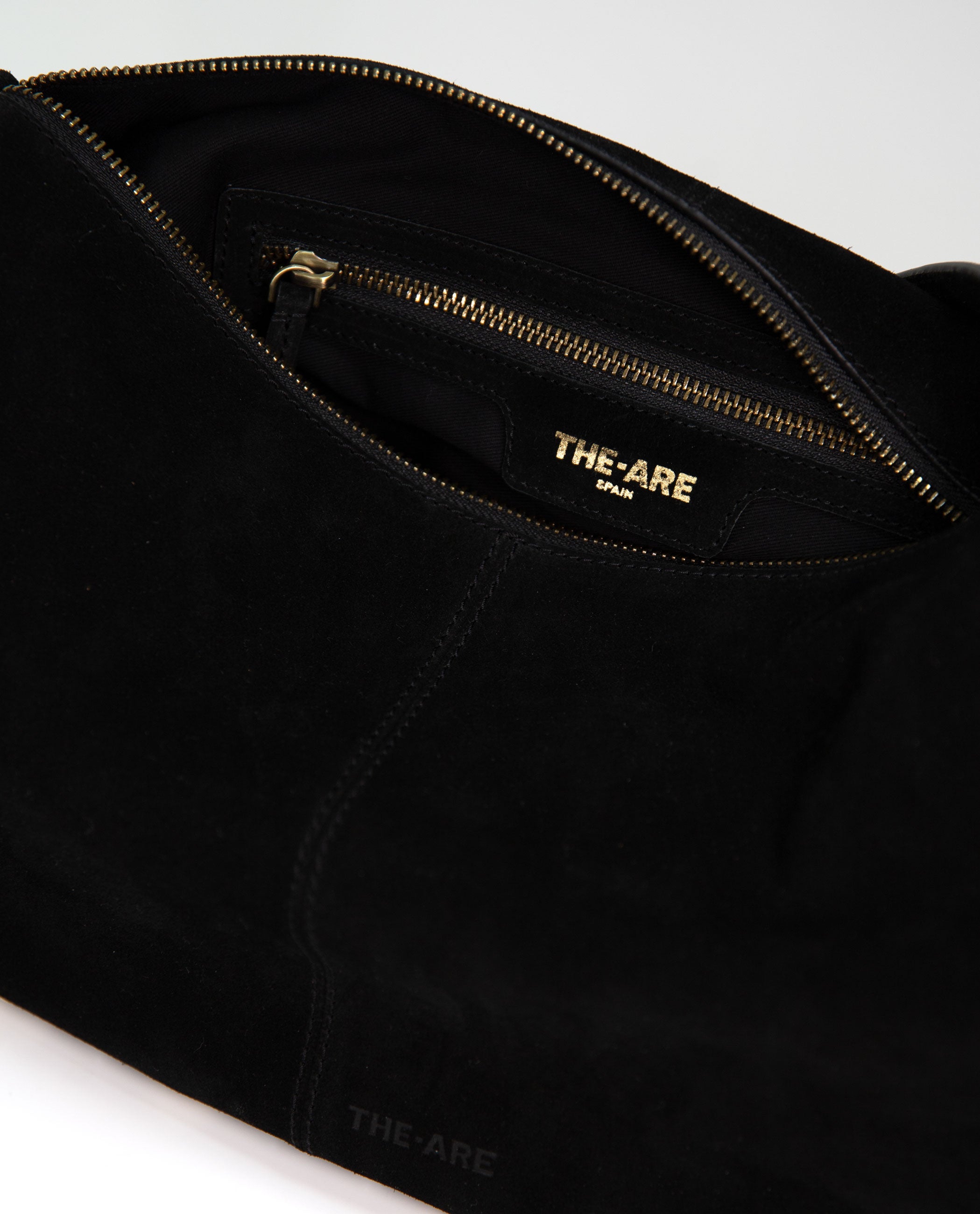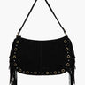- Bolso 100% piel de ante negra con flecos y tachuelas doradas.